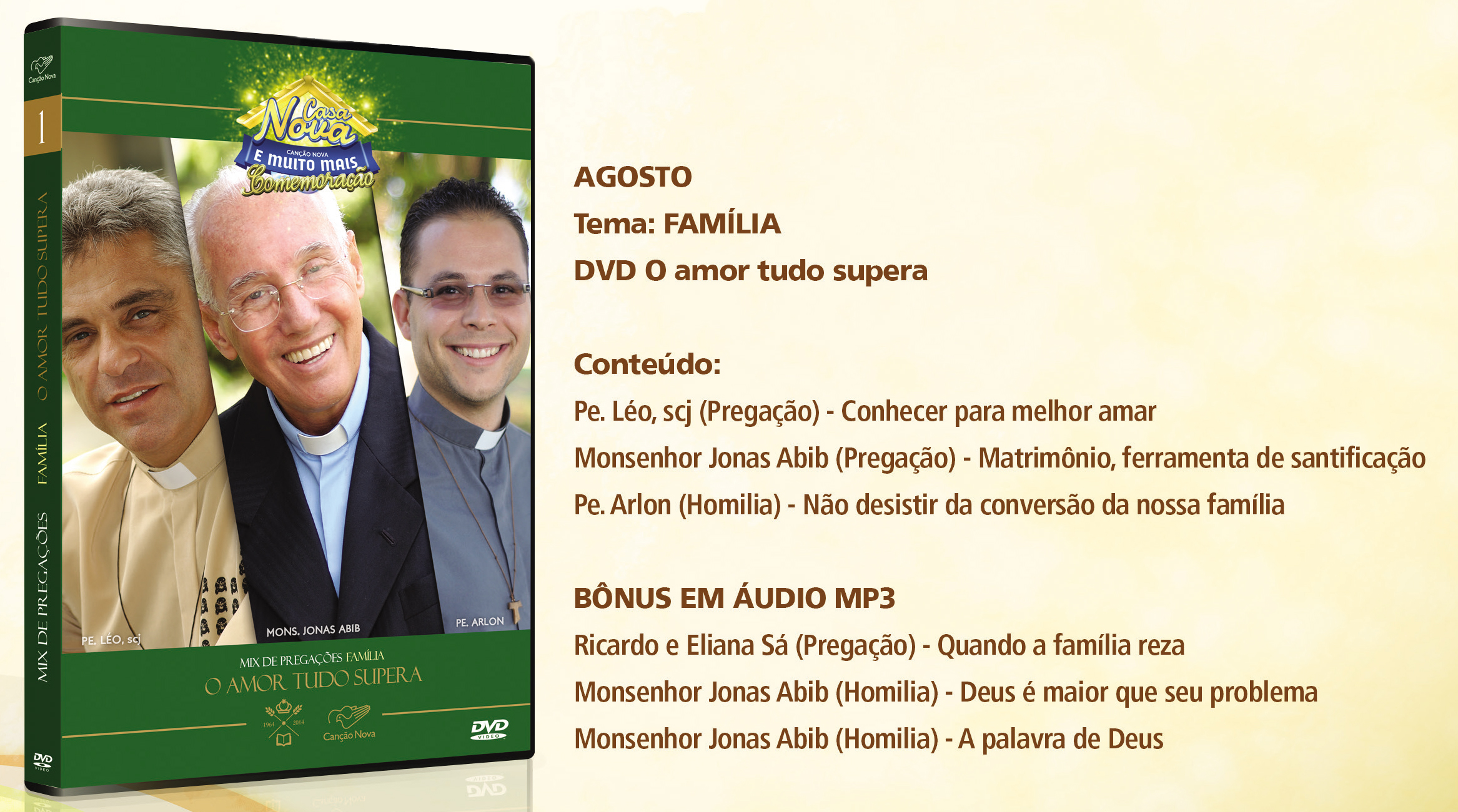 Os DVDs promocionais deste ano de ouro são coletâneas de pregações sobre família, cura interior, relacionamento e espiritualidade. Neste mês de agosto o álbum promcional será “O Amor tudo supera”, no qual padre Léo, monsenhor Jonas Abib e padre Arlon ressaltam a força do amor e como podemos ser felizes com nossa família.